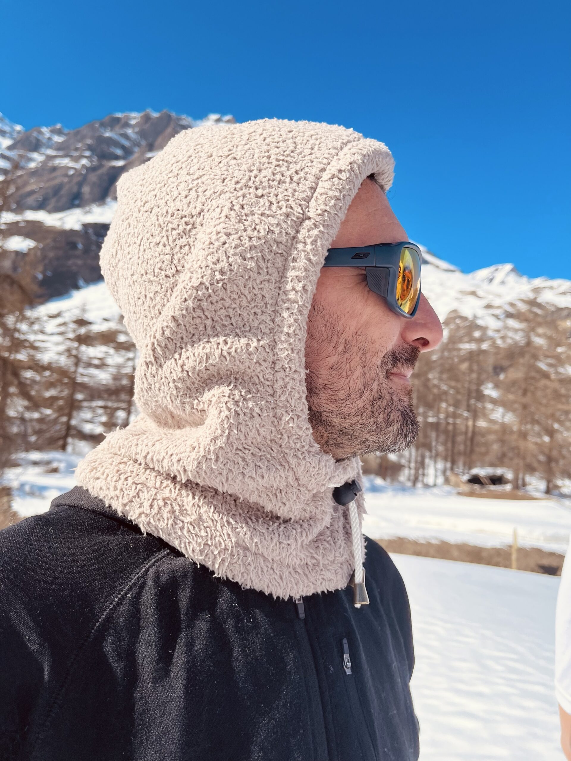 La cagoule est fabriquée à partir d’anciennes couvertures. Elle protège le cou et la tête pour rester au chaud en toutes circonstances.