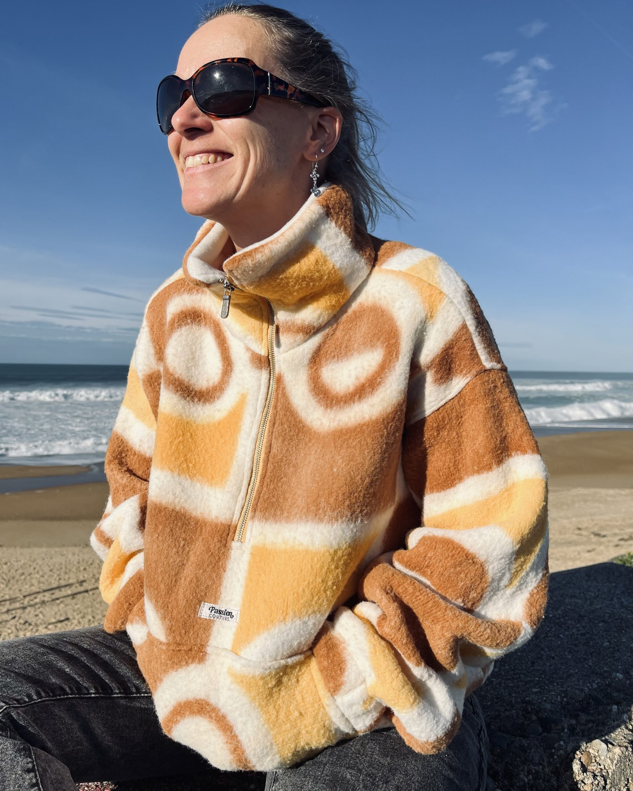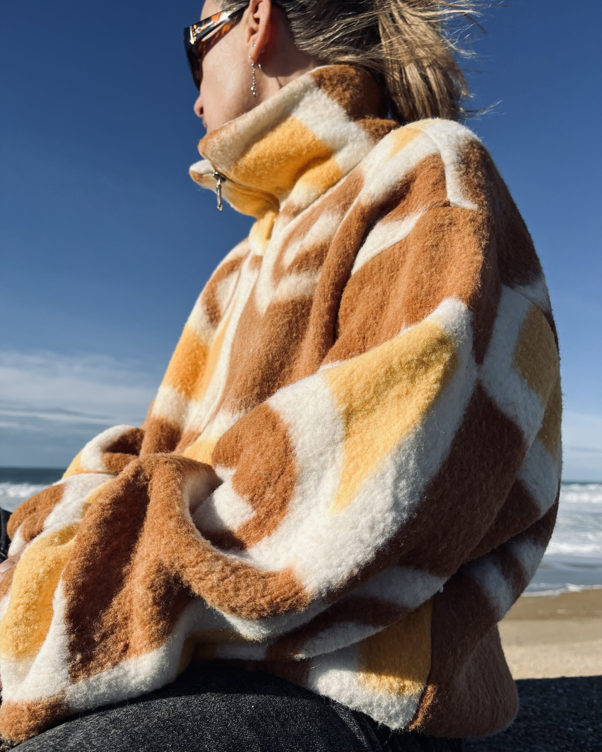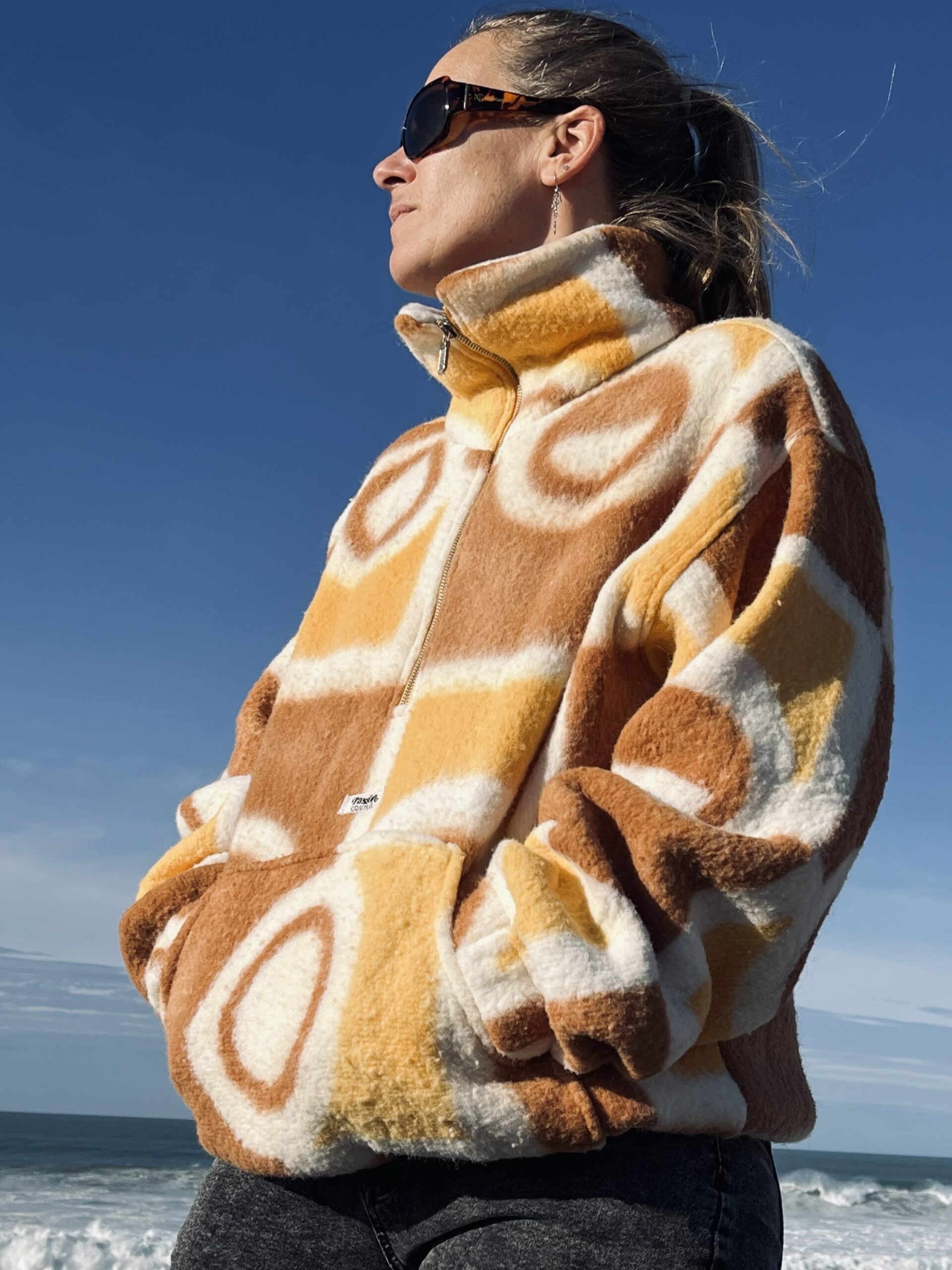 Confectionnée à partir d’une couverture vintage, la polaire est efficace contre le froid. Elle apporte un côté chaleureux et confortable, idéale pour affronter l’hiver.