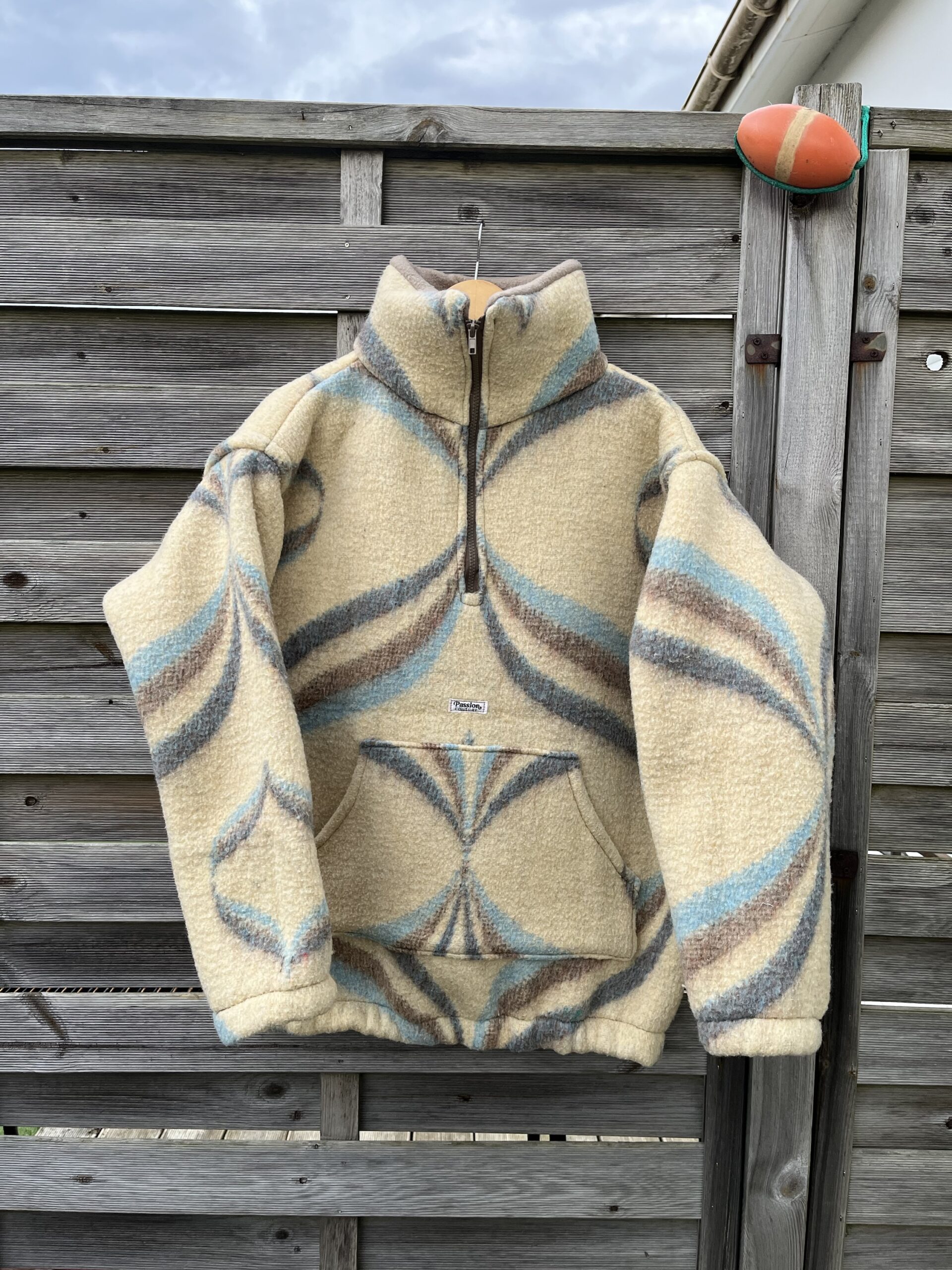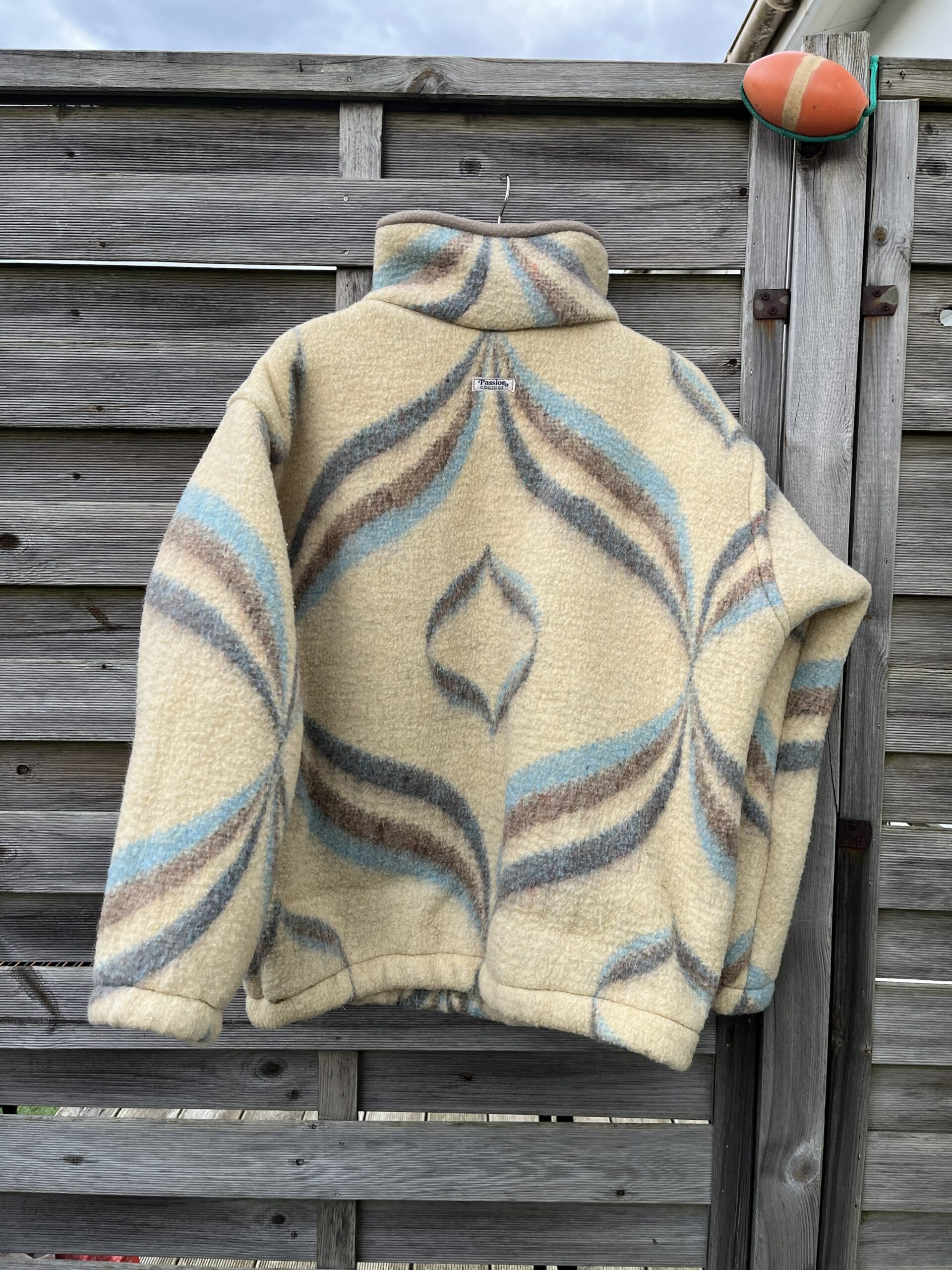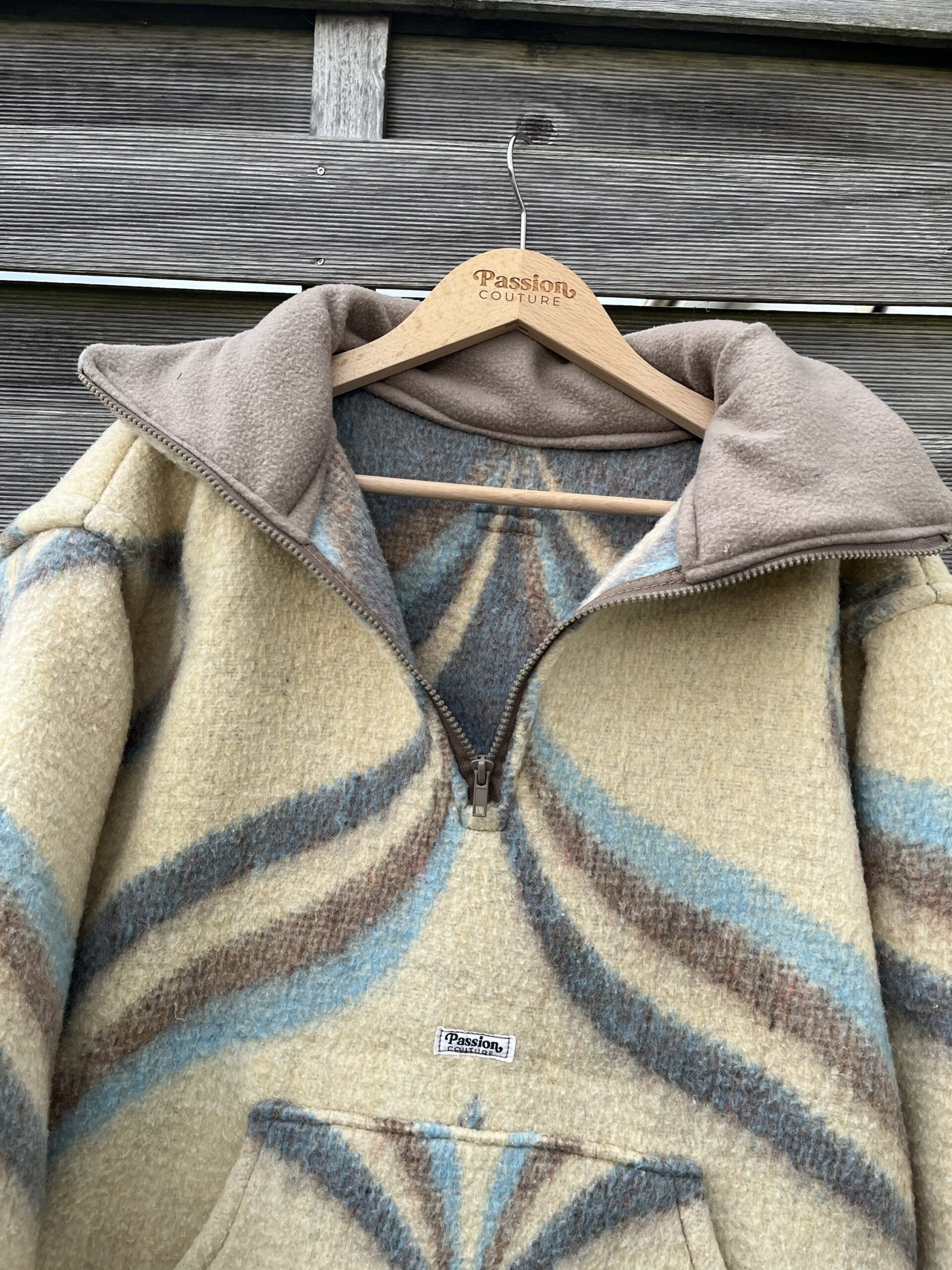 Confectionnée à partir d’une couverture vintage, la polaire est efficace contre le froid. Elle apporte un côté chaleureux et confortable, idéale pour affronter l’hiver.
